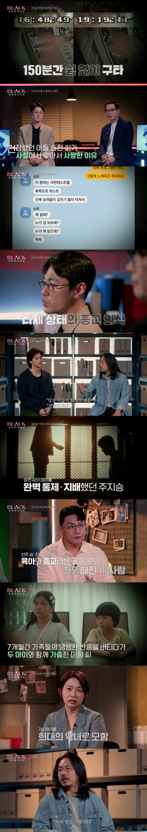주로 늦은 밤과 새벽에 이어진 추궁과 비난은 승현 씨로 하여금 자신이 희대의 패륜아이며, 부모님과 절에서 몇천만 원을 뜯어내려 했다는 등 가짜 고백이 담긴 자필 자술서를 쓰게 만들었다. 자극적인 범죄 고백마다 지장을 찍은 이상한 자술서들이었지만, 승현 씨의 어머니는 이 내용을 믿었다. 승현 씨의 어머니는 나체 상태로 절에서 종교의식을 할 만큼 이곳에 대한 믿음이 가득했다. 이 '종교의식'에 대해 알고 충격을 받은 승현 씨는 탈출을 꿈꿨으나 안타깝게도 죽기 전날까지 자술서를 작성했다.