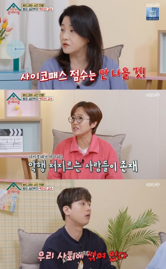 사이코패스는 타고 나는 것인지에 대한 질문에 박지선은 "인간의 모든 행동은 유전의 영향과 양육의 영향이 있다고 생각한다. 어릴 때 남에게 피해를 끼치지 않는 것이 얼마나 중요한지 배워야 하는데 아이를 학대하는 것도 잘못이지만 잘못을 하는데 혼내지 않는 것이 정말 문제다. 잘못을 하면 혼이 나야한다. 그 행동을 하면 안 된다는 걸 배워야 하는데 배우지 않는다는 것이 문제다"고 단호하게 말했다.