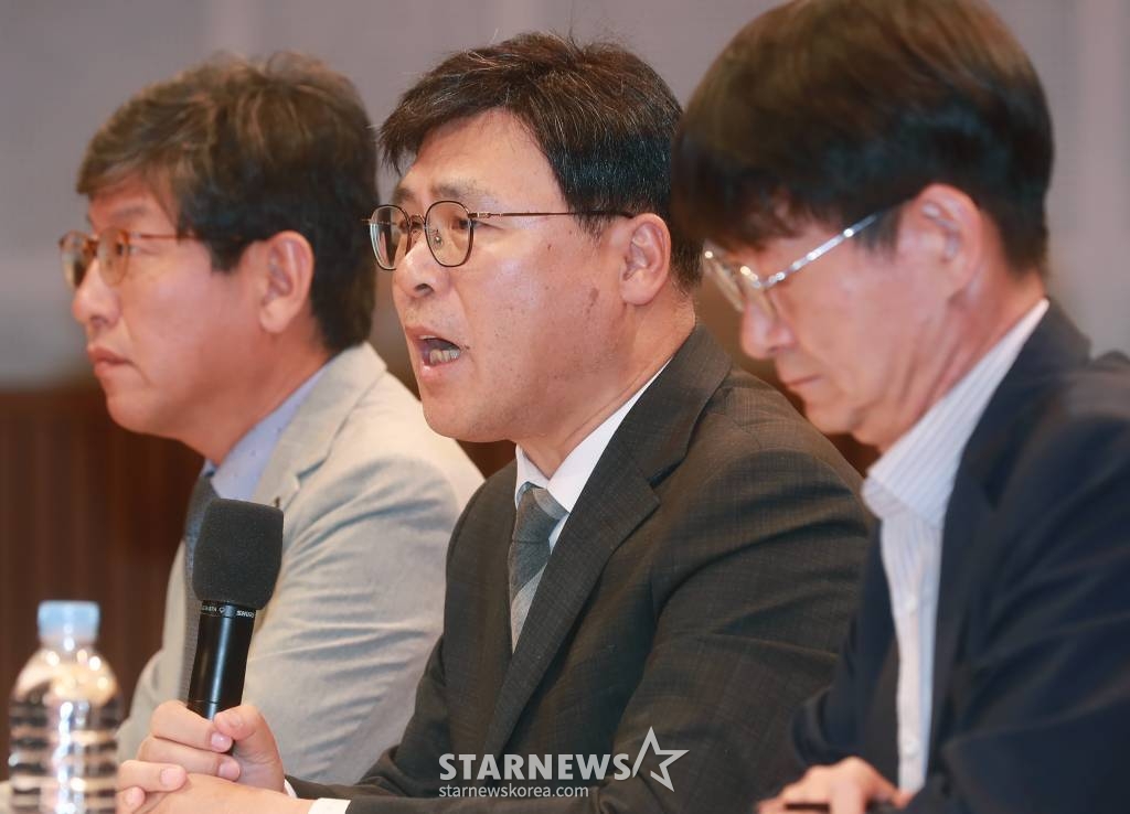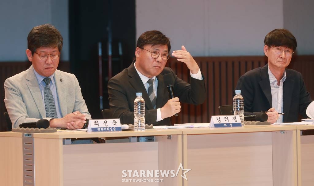 KBS는 8일 오전 서울 영등포구 여의도동 KBS 아트홀에서 수신료 분리징수 권고 관련 기자간담회를 진행했다. 이날 김의철 사장, 최선욱 전략기획실장, 오성일 수신료국장이 참석했다.