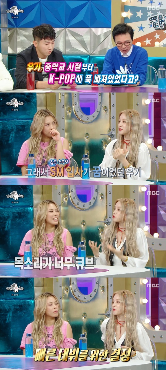 '라디오스타'에서 걸그룹 (여자)아이들 우기가 SM 입사가 꿈이었다고 밝혔다.