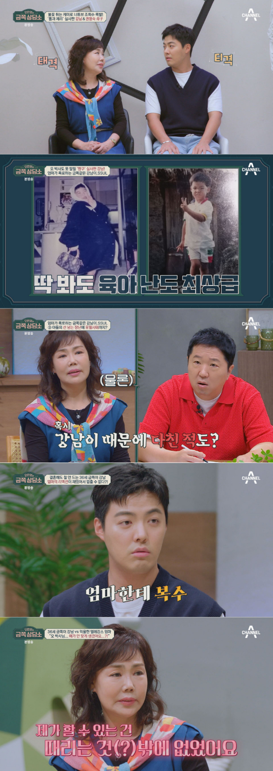 이어 강남은 어릴 적 엄마에게 고강도 체벌을 받았음을 알리며 증거 사진을 제출한다. 울버린(?)에 버금가는 엄마의 실체를 폭로하는데. 이에 오은영 박사는 체벌의 기억이 마음에 맺혀있는 것 같다 짚어내며, 어머니 권명숙에게 강남을 체벌해야만 했던 이유를 물었다. 그러자 어머니 권명숙은 되려 "얘를 안 때리면 어떻게 해야 되냐"며 오박사에게 역 질문해 웃음바다를 만들었다는 후문. 이어 권명숙은 강남이 운전 중 사이드미러를 가리거나, 운전하는 차 뒤에 매달리기도 했다며 위험천만한 일화를 공개, 강하게 훈육할 수밖에 없던 입장을 밝힌다.