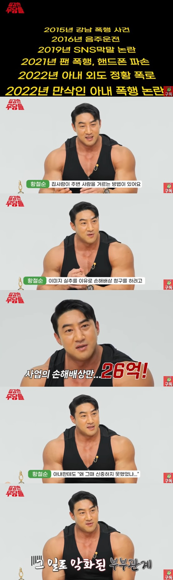 또한 황철순은 이 밖에도 폭행, 음주운전, 사기 등 각종 구설수에 올랐다고 고백했다. 그는 "구설수로 사업의 손해배상만 26억"이라고 전했다.