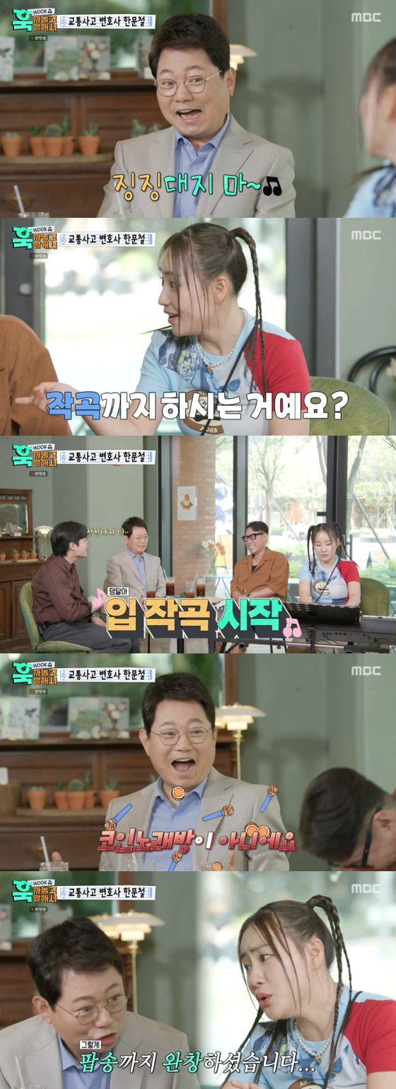 한문철은 또한 대화 중간중간 끊임없이 곡조를 흥얼거리더니 "노래 완성되면 제가 부르고 싶다"고 본색을 드러내 폭소를 안겼다. 윤종신은 "변호사님 목소리는 샘플 따서 써도 되겠다"며 독특한 음색에 웃음을 터뜨렸고, 조현아는 "작곡까지 하시는 거냐"고, 이용진은 "여긴 코인노래방이 아니다"고 당황해 웃음을 더했다.