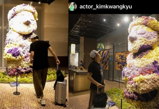 김광규는 20일 자신의 인스타그램에 제주여행 인증으로 캐리어와 함께 그랜드하얏트제주의 상징 1만송이 생화로 만든 '꽃하루방'과 만난 사진을 올렸다.