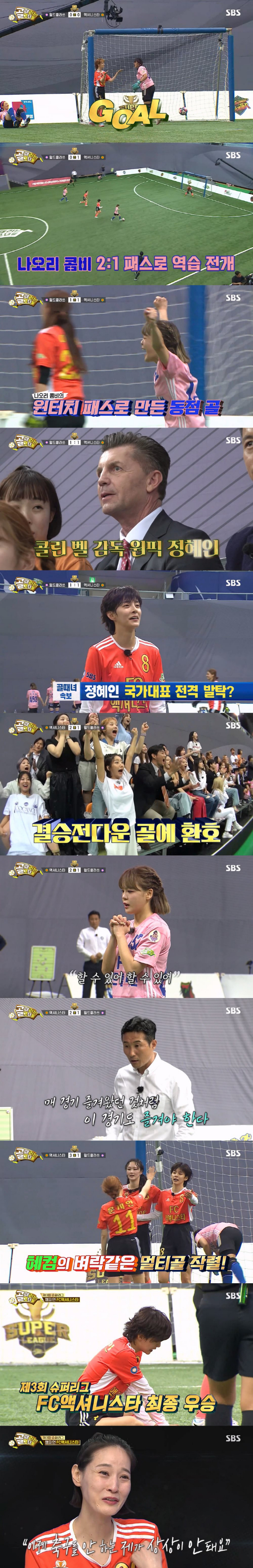 기세가 오른 '액셔니스타'는 후반전 초반부터 강하게 몰아붙였다. 후반 2분, 사오리의 공을 가로챈 정혜인이 침착한 땅볼 슈팅으로 추가골을 기록하며 완벽한 리드를 잡아냈다. '월드클라쓰'는 곧이어 페널티킥 기회를 얻어냈지만 사오리의 슈팅이 골문을 빗나가며 기회를 살리지 못했다. 사오리마저 자책에 빠지자 작전타임으로 선수들을 부른 이을용 감독은 "우승하는 건 그 팀의 운도 따라야한다. 매 경기 최선을 다해 올라왔다. 마지막 경기도 재밌게 즐겨야 한다"고 선수들을 격려했다.