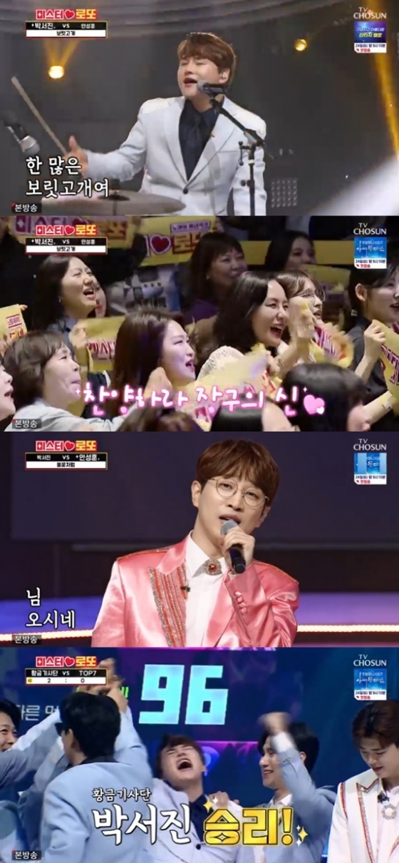 황민호에 이어 연속 99점을 받은 박서진은 96점을 받은 안성훈을 꺾고 승리의 기쁨을 만끽했다.