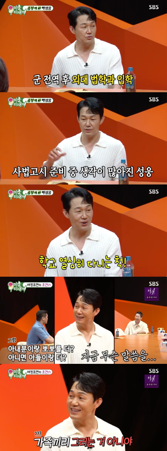 박성웅은 이어 "1학년 때 사법고시를 준비하다 현타가 왔다. 서른이 넘어서 계속 이 직업을 갖고 출퇴근하면 행복하지 않을 것 같고, 심심할 것 같았다. 그때 갑자기 느닷없이 배우가 하고 싶었다"고 말했다. 박성웅은 "아버지한테는 3년 동안 말씀 안 드렸다. 학교 열심히 다니는 척 했다"고 덧붙여 웃음을 안겼다. 신동엽은 이에 "법대 간 것도, 갑자기 배우한 것도 신기하다"고 감탄을 전했다.