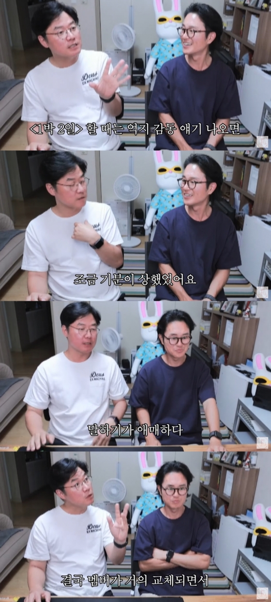 이날 나영석 PD는 "당시 억지 감동 엄청나게 했다. '1박 2일' 할 때 내가 좋아했다. 그땐 백두산 가고 독도 가고 억지까지는 아니지만, 감정적으로 뜨거웠던 시절이었고 그게 줄어들었다. '1박 2일' 할 땐 억지 감동 얘기가 나오면 조금 기분이 상했었다. 내가 진심인데 이 비슷한 감정을 느꼈으면 좋겠기에 하는데 왜 억지라고 하지 싶었다. 나중에 되니까 내가 오바했고 어렸구나 싶더라"라고 털어놨다.