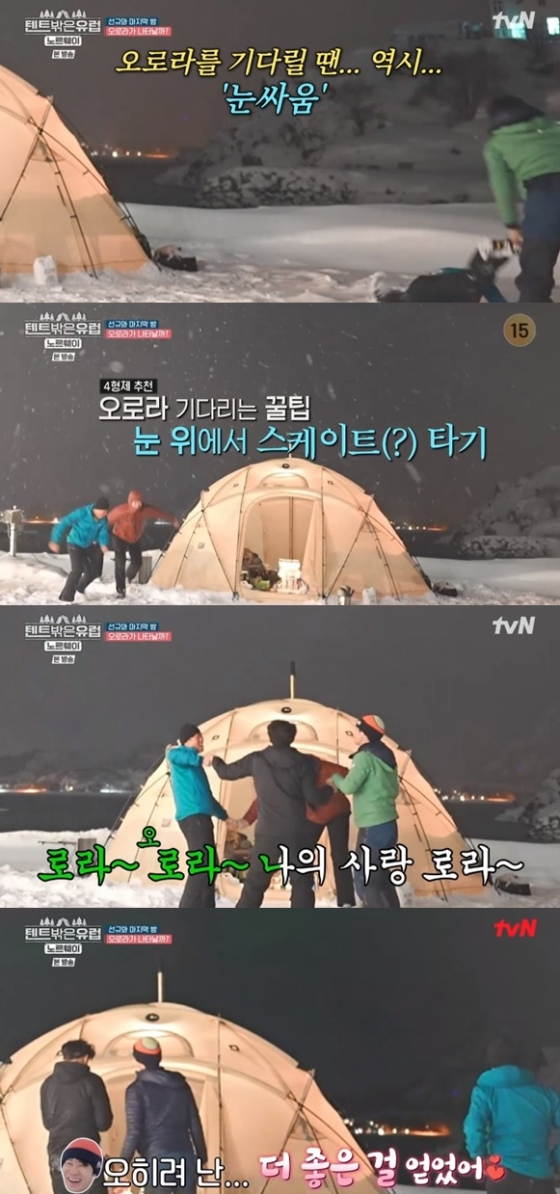 4형제는 오로라를 기다리는 동안 노래를 틀고 함께 노래를 부르며 즐겁게 춤을 췄다. 이후 텐트 밖으로 나가 눈싸움과 눈 찜질, 운동화 스케이트 대결을 하며 잊지 못할 추억을 만들었다. 또 멤버들은 기우제를 지내는 원주민처럼 손을 잡고 변집섭의 '로라'를 목청껏 부르며 하늘을 바라봤다.