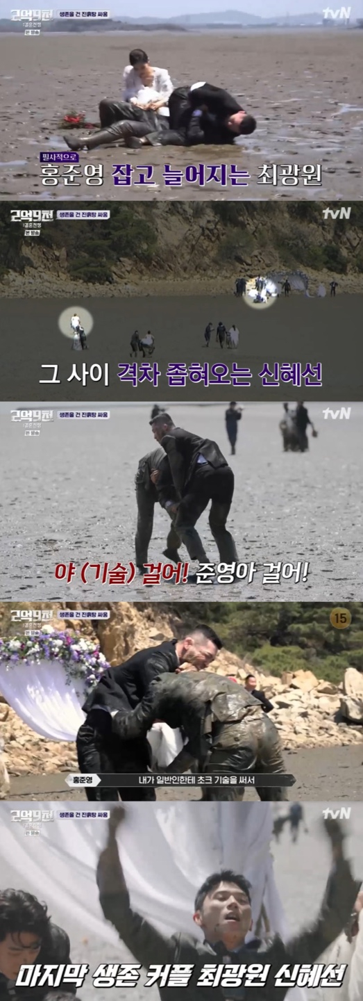 댄서 커플 이상민·오수현 커플은 나머지 9쌍의 커플과 확연한 거리 차이를 벌이며 완벽한 1등을 차지했다. 반면, 2등에서 7등까지 커플은 비슷한 거리를 유지했고, 나머지 하위권 8등에서 10등 커플이 생존을 위해 치열한 각축전을 벌였다. 그중 8등을 유지하던 최광원·신혜선 커플은 단 한 등수 차이로 생존에 실패할 위기해 처했었다. 이에 최광원은 "죽기 전 마지막 발악해 보자"라고 다짐하며 작전을 세웠다. 최광원은 지쳐있는 신혜선에게 " 꽃 들고 천천히 오고 있어라. 내가 앞에 한 명 잡겠다"라고 말한 후 달려가 격투기 선수인 홍준영과 그의 예비부부인 박나영 커플을 몸으로 잡으며 갯벌에서 육탄전을 시도했다.