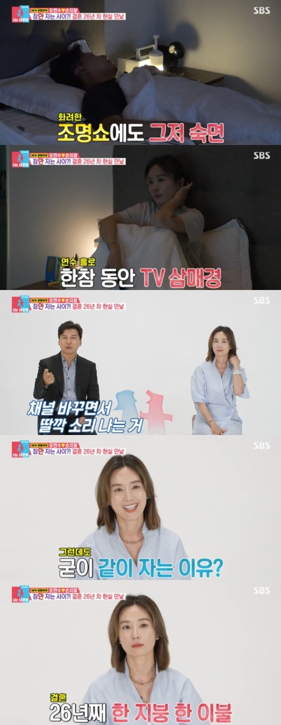 그런데도 굳이 같이 자는 이유에 대해 묻자 오연수는 "그렇게 생각하실 것 같다. 근데 그런 생각 안 해본 것 같다. 싸워도 한 번도 나가서 자거나 해본 적 없고, 등 돌리고 씩씩거리면서 자도 한 침대에서 26년 동안 잤다"며 '잠만 자는 사이'가 아닌 '잠은 꼭 같이 자는 사이'임을 드러냈다.