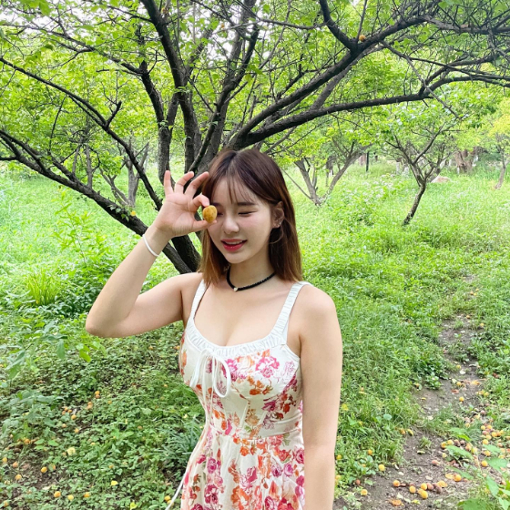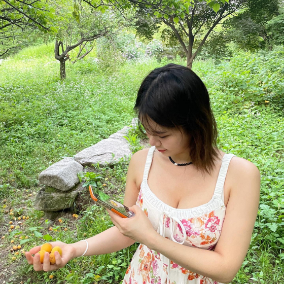 공개된 사진에는 수풀이 우거진 곳에서 손에 든 살구를 촬영하는 맹승지의 모습이 담겼다.