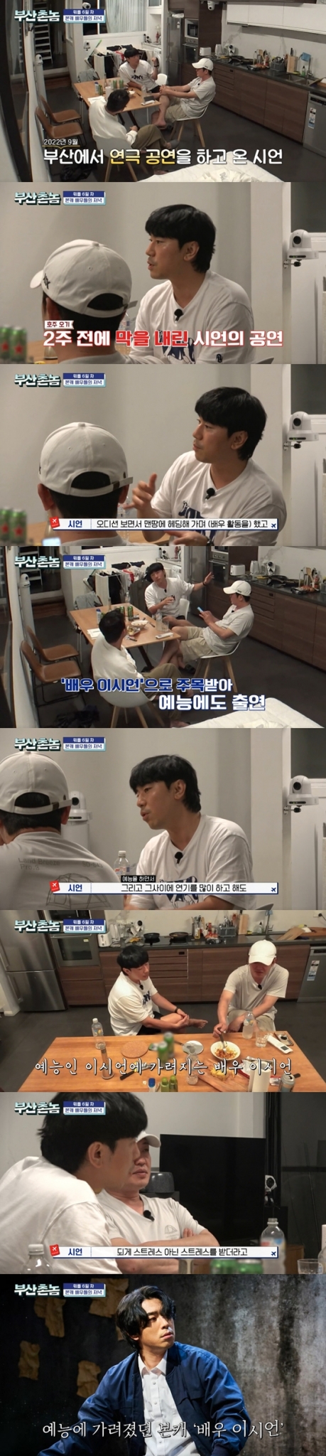 앞서 이시언은 2020년 12월 방송을 끝으로 MBC '나 혼자 산다'에서 하차했다. 약 5년 간 '나 혼자 산다'에 출연해 시청자들에게 많은 사랑을 받았다. '대배우' 외에 여러 별명을 얻을 정도로 '예능 아이콘'으로 주목 받았다. 또한 그는 기안84, 성훈, 헨리 등과 '네 얼간이'라는 조합으로 시청자들에게 사랑을 받았다. '나 혼자 산다'는 배우로 주목 받았던 이시언을 '예능인'으로 탈바꿈한 프로그램이자 그를 더 많이 알린 프로그램이었다. 자신을 알리는 '나 혼자 산다'였지만, 한편으로는 배우로 활동을 해도 결국 예능 프로그램에서의 활약이 시청자들에게 각인되는 상황에 고민을 해왔던 이시언이었다. 이에 다른 스트레스까지 '부산촌놈'에서 고백해 시청자들의 이목을 끌었다.