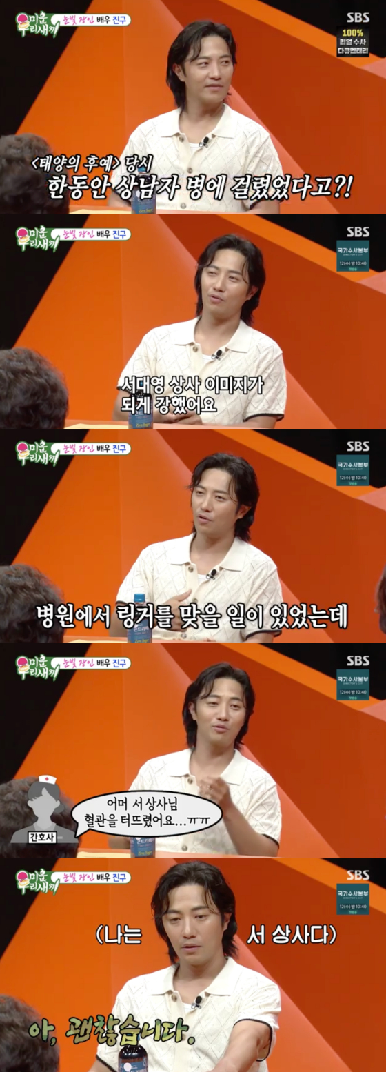 신동엽은 이날 진구가 "'태양의 후예'로 국민 상남자 타이틀을 획득했지 않냐. 그 이후에 한동안 상남자 병, 사나이 병에 걸렸다더라"고 밝혀 웃음을 자아냈다. 진구는 이에 "서 상사 이미지가 세긴 했다. 해외에서도 서 상사로 알아봐주셨으니까"라며 이유를 전했다.