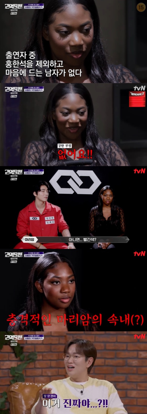 두 번째 순서로 홍한석과 마리암 커플이 단상 위에 올랐다. 먼저 마리암에게 "출연자 중 연인 홍한석을 제외하고 마음에 드는 남자가 있냐"라는 질문이 주어졌다. 마리암은 "없어요, 아니요"라며 강하게 부정했다. 그러나 거짓말탐지기 측정 결과 마리암의 발언은 거짓으로 판정됐다. 이를 들은 홍한석은 "거짓말쟁이"라며 귀여운 질투를 했다. 이에 마리암은 "나 말을 이해 못 했다. 이거 문제가 있는 것 같다"라며 진땀을 흘렸다. 또, 홍한석에게 "믿어"라고 오히려 큰소리 치며 적반하장의 모습을 보였다.