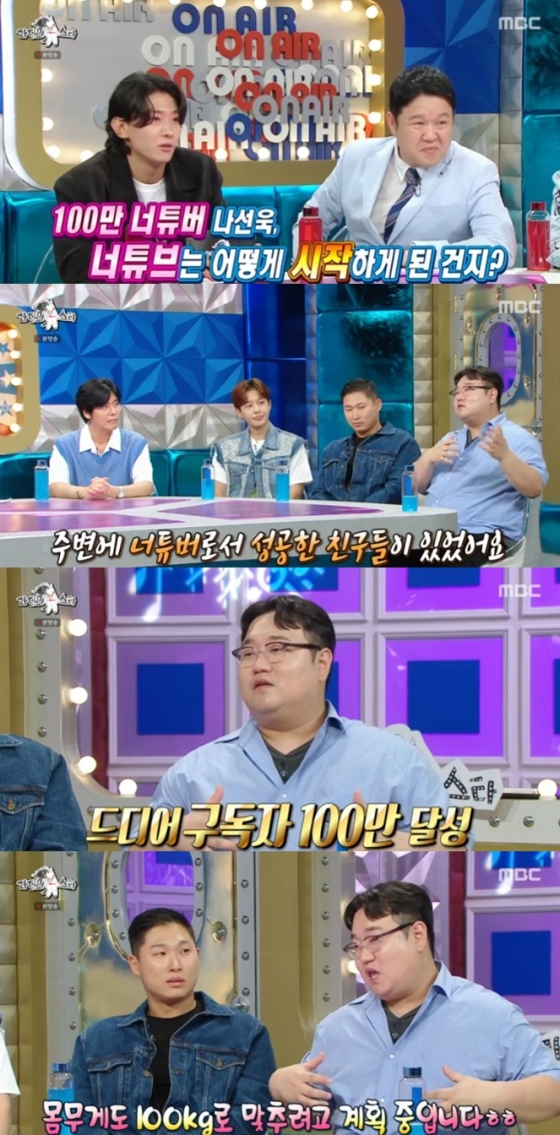 나선욱은 '유튜브를 얼마나 했냐'는 질문에 "5년 됐다. 5년 해서 드디어 구독자 100만이 됐다. 구독자 100만 됐으니까 몸무게도 100kg으로 맞추려고 계획중이다. 지금은 120kg이니까"라며 너스레를 떨어 모두를 폭소케 했다.