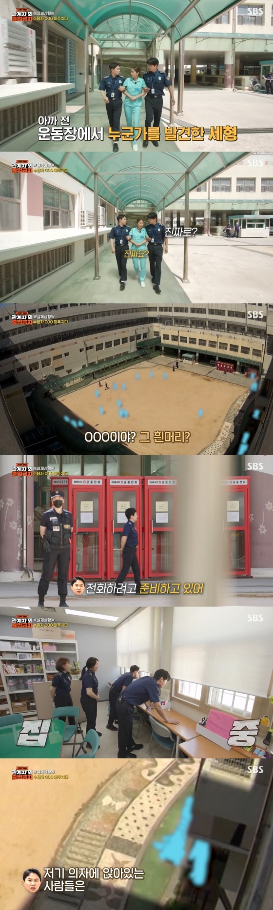 이후 세 사람은 교도관 사무실로 들어갔고, 건물 위 창가에서 운동장을 다시 바라봤다. 양세형은 교도관들에게 "아까 ○○실 씨 있던데?"라고 물었고, 이이경은 죄수들이 모여있는 모습을 보곤 "되게 모여 계시네"라고 설명했다.