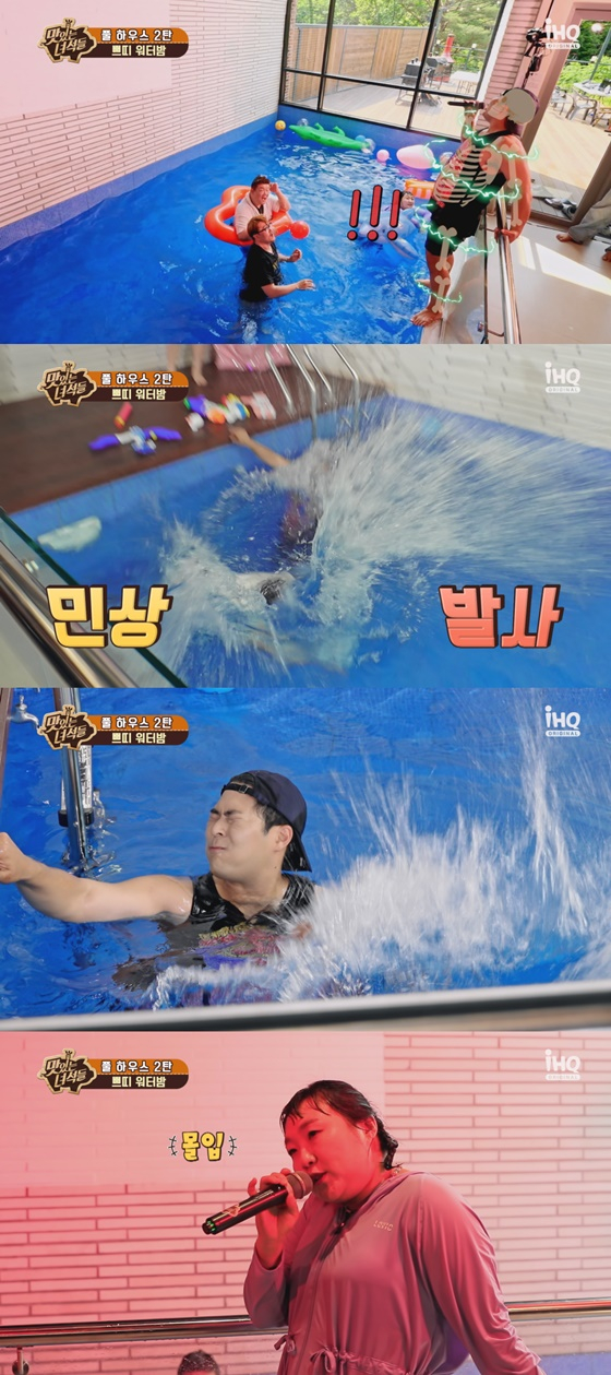 김해준은 갑자기 물속에 뛰어든 유민상의 물폭탄으로 웃음을 안겼고, 데프콘은 신나는 노래로 본캐가 가수임을 입증시켰다. 뒤를 이어 김해준도 마이크를 잡고 흥 폭발을 이끌었으나 데프콘이 던진 비치볼이 급소에 맞는 돌발 상황이 벌어졌다.