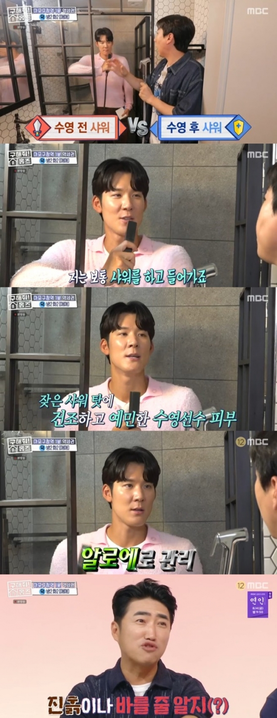 박태환은 "나는 보통 샤워를 하고 들어간다. 그래서 수영선수들이 보통 피부가 건조하고 트러블이 나는 경우도 많다. 저는 그거를 보디로션 바르기 전에 알로에를 발라서 관리한다"며 피부 관리에 대합 팁을 전수했다.