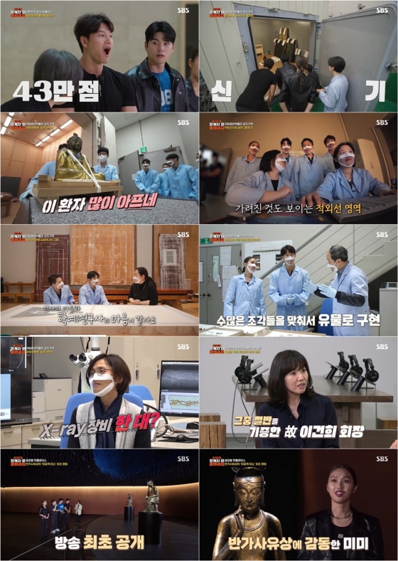 이날 김종국-양세형-이이경-미미는 국립중앙박물관에 들어서자마자 웅장한 규모에 압도됐다. 현재 43만점의 유물이 소장되어 있고 이중 단 1만여점이 전시중이라는 국립중앙박물관은 대중에게 익숙한 전시실 밑 은밀한 지하 공간에 위치한 진짜 보물창고인 '수장고', 수많은 유물을 복원하고 보존하는 문화재의 병원인 '보존과학실'이 있다는 사실이 드러나 호기심을 자극했다.