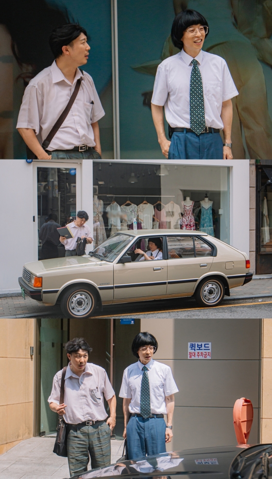 공개된 사진에는 편집숍이 가득한 거리를 배회 중인 상사맨 콤비의 모습이 담겨 있다. 세련된 거리 속 80년대 복고풍 패션 센스를 발휘한 두 사람의 비주얼이 시선을 끈다. 여기에 홈타운 자신감까지 장착한 유재석은 올드카를 당당하게 타고 존재감을 뽐내고 있다.