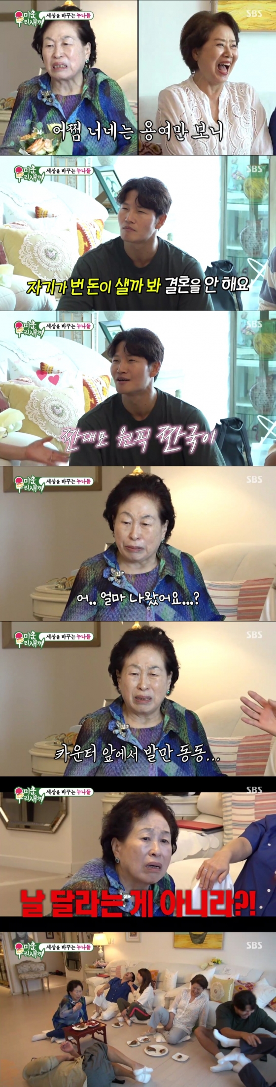 더 젊어진 것 같다는 종국의 인사에 기뻐하던 선우용여를 보던 전원주는 "젊은 것들이 눈들은 있나 봐, 나는 한번 안 보고 얘만 봐"라고 거침없는 멘트를 날려 폭소를 자아냈다. 어김없이 아들들의 결혼에 대한 누나들의 잔소리가 이어졌고, 상민은 "여기서 결혼이 제일 어려운 건 종국이다. 자기가 번 돈이 샐까 봐 결혼을 안 한다"라고 폭로했다. "휴지를 두 칸 썼다가 혼났다"라는 종민의 추가 폭로가 이어지자 질색하던 누나들과 달리, '짠순이 대모' 전원주만이 매우 흡족해하며 종국을 껴안아 큰 웃음을 안겼다.