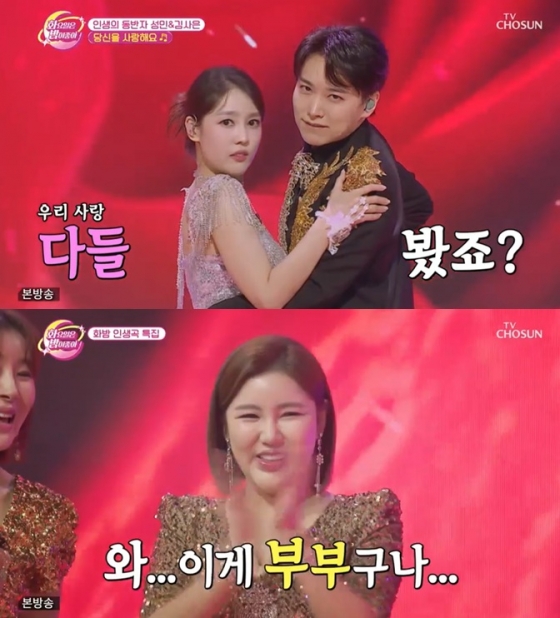 이어 성민과 김사은 부부가 '당신을 사랑해요'를 부르며 듀엣 무대를 선보였다. 송가인은 김사은의 노래를 듣고 "노래 잘한다"고 감탄하는가 하면, 성민과 김사은의 스킨십 퍼포먼스를 보고 이미리와 따라서 춤추며 웃음을 자아냈다.