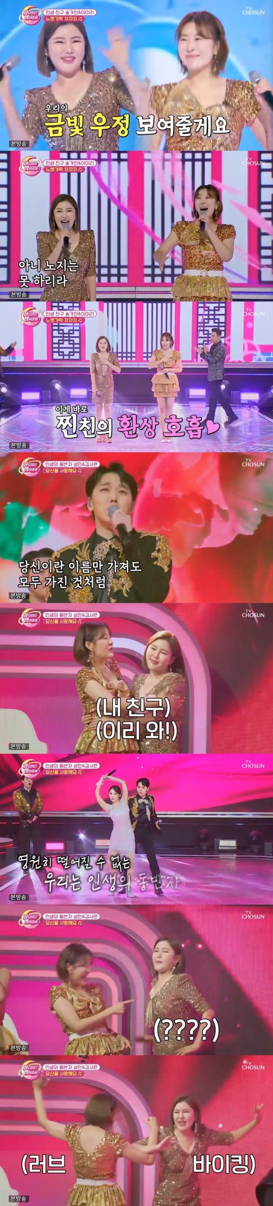 이날 송가인과 이미리가 18년 우정의 친구로 등장했다. 송가인과 이미리는 금색 의상을 맞춰입고 단발머리를 해 닮은꼴 뒤태를 보였다.