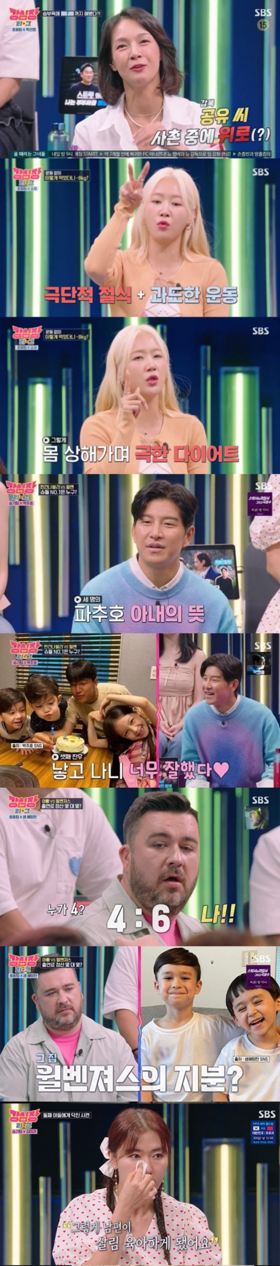 개그우먼 김미려는 남편인 배우 정성윤에 대한 고마움을 전했다. 김미려는 "둘째 아들이 태어날 때 선천성 콜라겐 결핍증이 있었다. 태어나자마자 다른 아이들보다 턱도 작았고 폐렴으로 호흡 위기도 왔었다"면서 "당시에 둘째가 아프다보니 산후 조리도 못 했다. 바로 일을 시작했고 그 때 남편이 연기에 대한 열정을 접었다. 살림해주고 육아도 한다"고 전해 눈길을 끌었다. 김미려는 "힘들었지만 가족의 끈끈함은 더 생긴 것 같다"며 모두의 박수를 받았다.