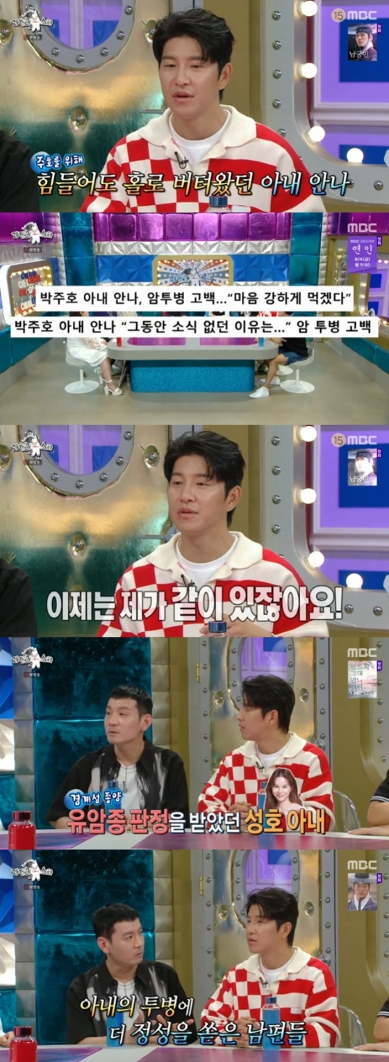 이에 정성호는 "이건 진짜 중요하다. 우리 공통점인지 모르겠는데 저희 아내도 경계성 유암종으로 수술을 했다. 그렇기 때문에 제가 더 아내에게 더 잘하는 게 있다"며 박주호의 이야기에 공감했다.