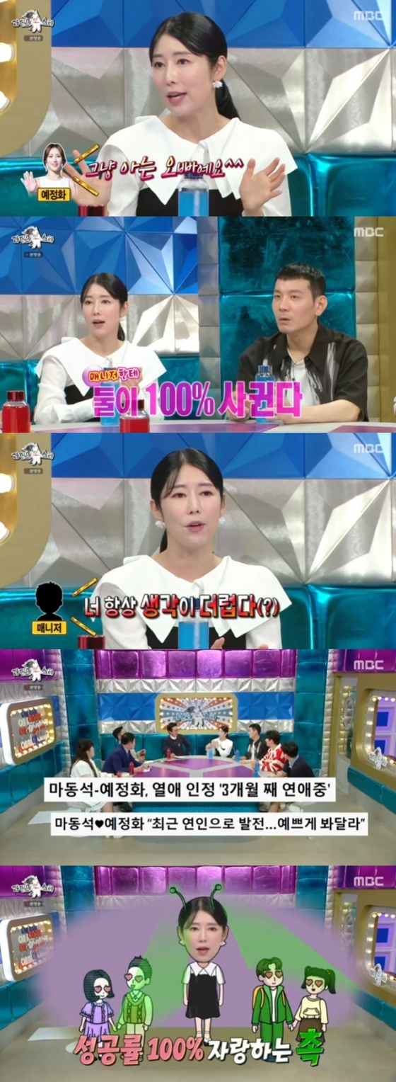 이어 그는 "예전에 '부산행' 시사회에 예정화 씨랑 같이 영화를 보러갔다. 그때 예정화 씨가 마동석 씨를 만나서 인사를 했다. 근데 뭔가 둘이 사귀는 것처럼 느껴졌다. 그래서 (예정화에) 저 분이랑 친하냐고 물으니, 예정화 씨가 '아니, 그냥 아는 오빠다'라고 말했다. '그랬구나' 했는데 제가 매니저한테 '둘이 100%로 사귄다. 아니면 둘이 뭔가 있다'고 말했다"며 당시를 상황을 떠올렸다.