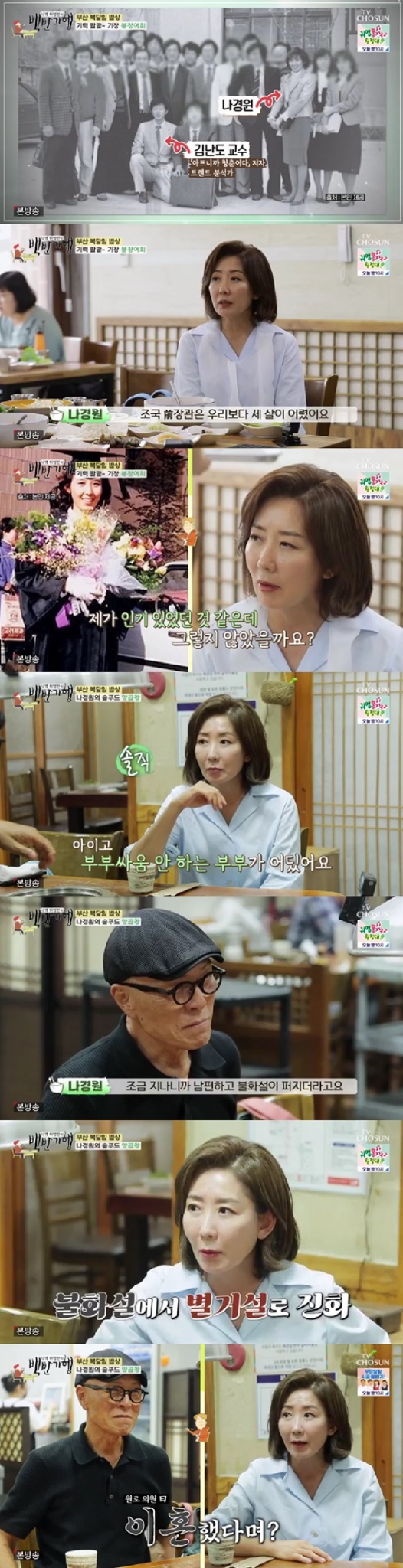 이에 허영만은 나경원과 서울대 법대 82학번 동기인 조국 전 장관을 언급하며 "조국 전 장관은 인기가 있었냐"고 다소 곤란한 질문을 했고, 나경원은 "3살이 어렸다. 예뻐하는 동생처럼 생각한 기억이 난다"고 조심스럽게 말했다.