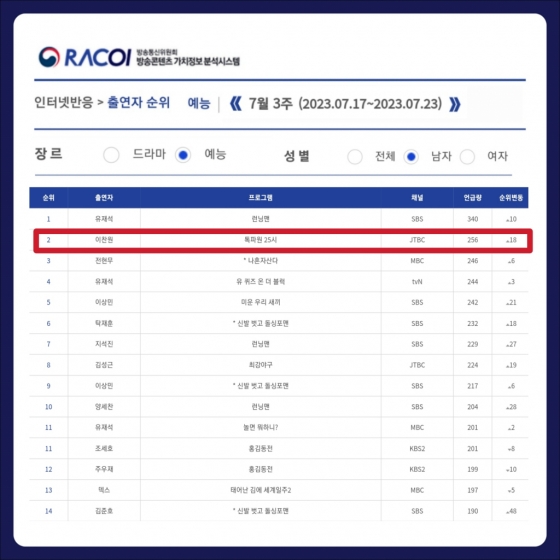 방송통신위원회 방송콘텐츠 가치정보 분석 시스템 RACOI에 따르면, 이찬원은 7월 3주(7월 17일~7월 23일) 인터넷 반응 분석에서 JTBC '톡파원 25시'로 남성 예능 출연자 2위를 차지했다.