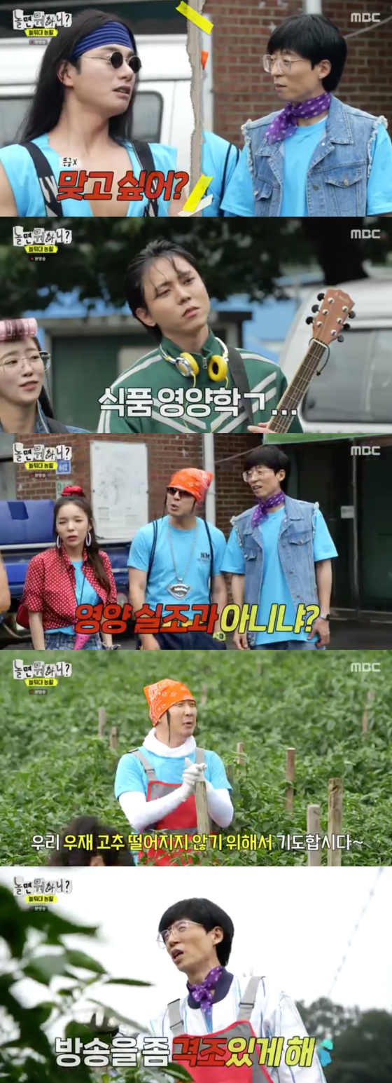 멤버들은 이후 꽈리고추 수확에 나섰다. 유재석은 매번 "심봤다"고 소리치며 수확물을 자랑했고, 멤버들은 "입으로 따냐"며 질색해 웃음을 자아냈다. 또한 하하는 수확 도중 갑자기 "이 일용할 양식 다 신께서 주신 거다. 다 기도하자. 옆사람 손 잡아라"며 기독교학과에 몰입해 폭소를 유발했다. 박진주는 이에 함께 '당신은 사랑받기 위해 태어난 사람'을 불러 웃음을 더했다.