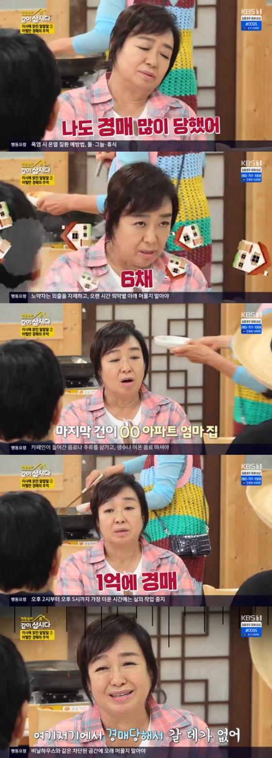 이를 들은 혜은이는 "나는 많이 당했다. 여섯 채 정도"라고 밝혔다. 결혼 후 경매를 당했다고 밝힌 혜은이의 말을 들은 박원숙은 "갑자기 화가 난다"고 말했다.