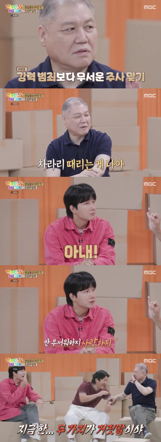 MC들은 이날 강력 범죄도 무서워하지 않던 권일용에 "무서워하는 게 있냐", "벌레 안 무서워 하시냐"고 물었다. 권일용은 이에 "내 피 뽑는 걸 못 본다. 평생 본 적이 없다. 안 보고 싶다"며 주사 바늘이 무섭다 밝혀 웃음을 자아냈다.