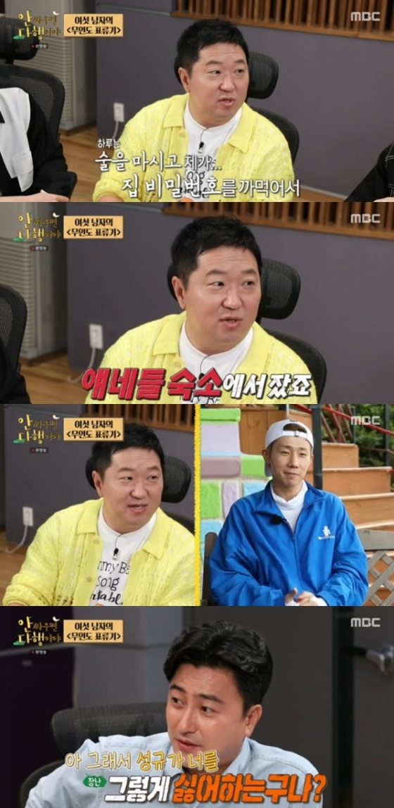정형돈은 "얘들 새벽 5시에 나가야하는데 제가 그때 들어갔다. 일어나니까 성규 침대였다"며 일화를 전했다. 이에 안정환은 "그래서 성규가 너를 그렇게 싫어하냐. 침대 버렸다고 하더라"며 농담해 웃음을 자아냈다.