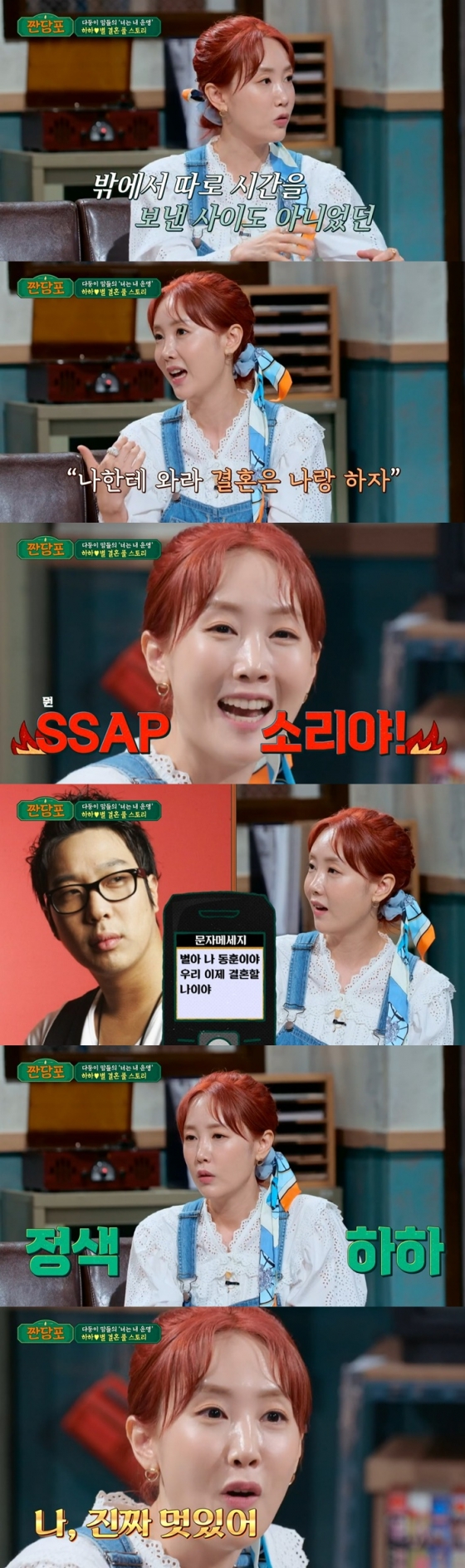 별은 30살이 되던 해 하하에게 문자 메시지를 받았다고 했다. 별은 "어느 날 아침에 모르는 번호로 문자가 왔다"며 "'별아, 나 동훈이야. 우리 이제 결혼할 나이야'라고 적혀 있었다"고 전했다.