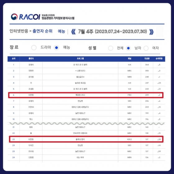 한편 이찬원은 KBS 2TV '불후의 명곡'으로 남성 예능 출연자 23위를 차지했다.