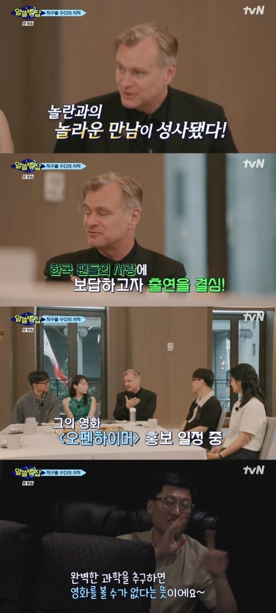 3일 방송된 tvN 예능 프로그램 '알쓸별잡' 1화에서는 MC 이동진(영화평론가), 유현준(건축가), 심채경(천문학자), 장항준(영화감독), 김민하(배우), 김상욱(물리학자)이 크리스토퍼 놀란(영화감독)과의 만남을 기대하는 모습이 그려졌다.
