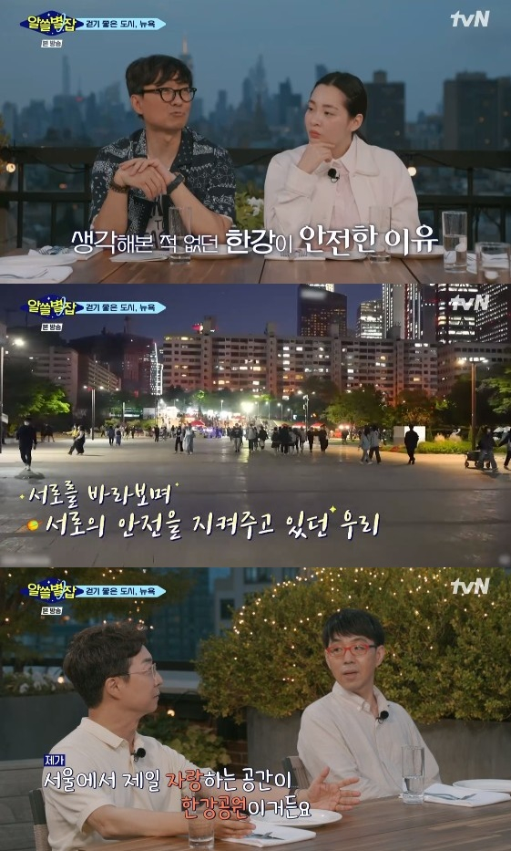 유현준은 "우리나라에 대표적인 게 한강 시민 공원이다. 거기는 아파트에서 다 내려다보인다. 그 말은 주택에서 내려다보니까 안전해진다는 거다. 감시를 받는 공간이 안전해진다. 그래서 거기는 새벽 1시에 가도 술 마셔도 된다. 제가 외국인 건축가 친구가 오면 서울에서 제일 자랑하는 공간이 '한강 공원'이다. '전 세계에 이런 공원 없다'"며 '한강공원'에 대한 애정을 드러냈다.