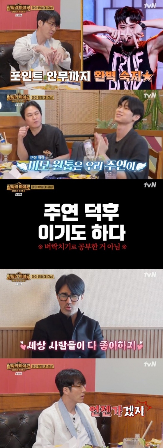 그러던 중 차승원은 주연에 "나는 너희 너무 팬이다. '더보이즈' 빅 팬이다. 영훈이, 현재, 제이콥, 에릭"이라며 '더보이즈' 멤버들의 이름을 말했다. 이어 그는 "'매버릭' 정말 너무 대단하더라"며 '메버릭'의 안무 중 시그니처 동작을 선보였다. 그러면서 "다른 멤버들도 잘생겼는데 유달리, 당연히 주연이다. 미모 원톱은 주연이다"라며 주연에 대한 애정을 과시했다.