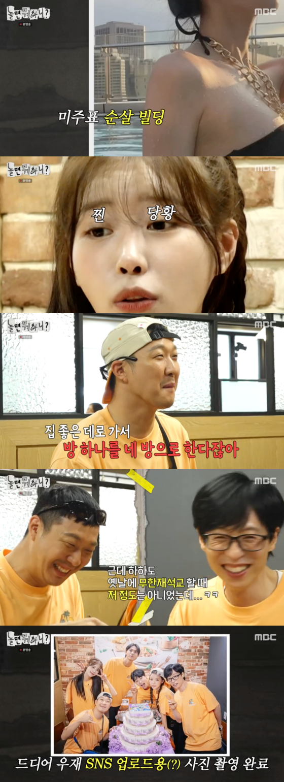 멤버들은 이날 이미주가 최근 SNS에 올린 수영복 사진을 언급했다. 하하는 "차마 '좋아요'를 못 눌렀다"고, 주우재는 "너무 다 벗고 있더라"며 이미주를 놀려 웃음을 자아냈다. 이미주는 "난 비키니 입으면 안 되냐"며 억울해했으나, 유재석은 "뒤에 빌딩이 휘어져 있다더라"고 폭로해 현장을 초토화시켰다. 이미주는 "내가 보정한 게 아니다"며 쩔쩔맸고, 박진주는 "이건 커버 못 친다"고 탄식해 폭소를 안겼다.