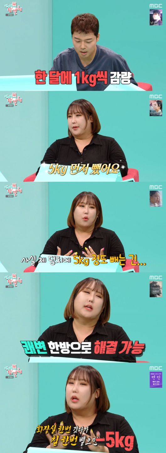 반면, 재재는 "똥이 5kg인 거냐"라며 충격을 금치 못했다. 그러나 풍자는 의연한 모습으로 "화장실 갔다가 침 한 번 뱉으면 5kg 정도 빼진다"라고 너스레를 떨어 모두를 폭소케했다.