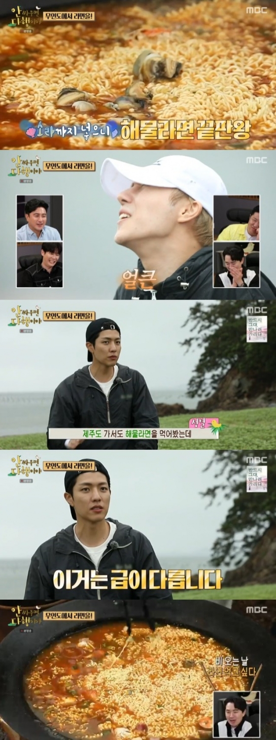 멤버들은 솥뚜껑에 라면을 끓이며 잡은 해산물을 넣고 국물 맛을 한층 더 진하게 만들었다.