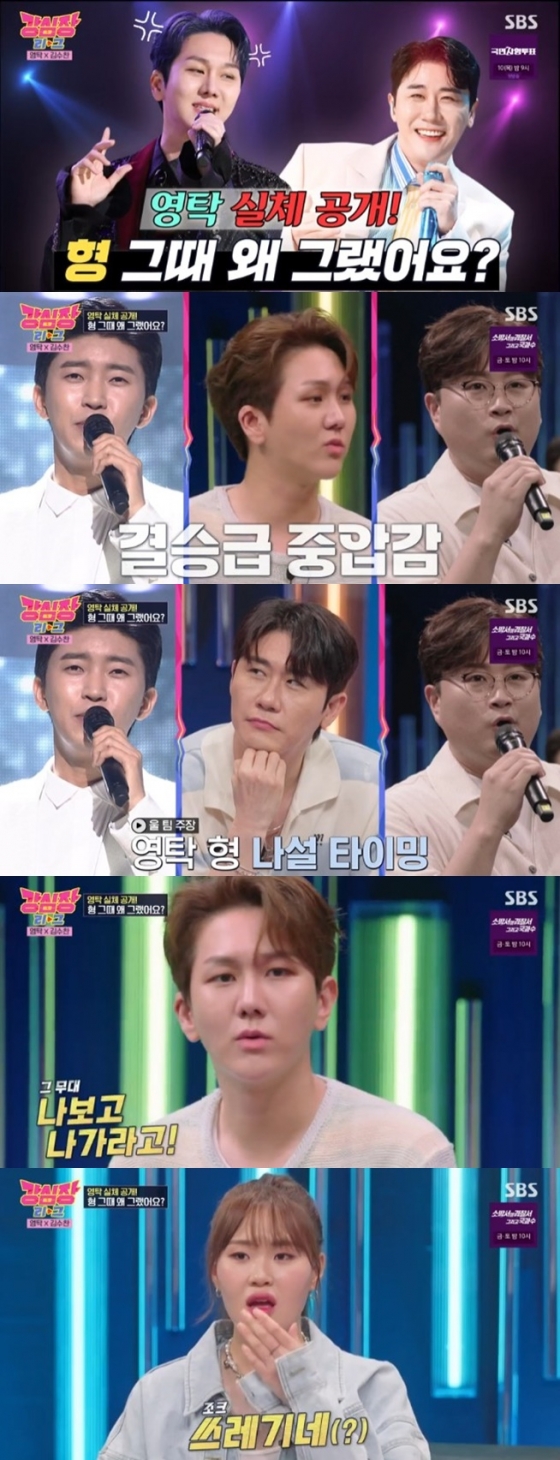 김수찬은 영탁을 가리키며 "솔직히 그 때 이 형 인성을 의심했었다"고 말해 긴장감을 자아냈다. 이에 영탁은 "지금 심정지 올 거 같다"며 심장을 부여잡았다.