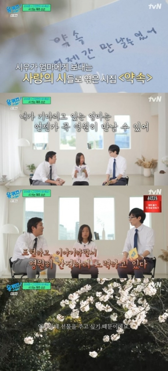 이날 출연한 민시우는 세상의 모든 것에서 영감을 받아 담백한 시로 풀어내는 어린이 시인이다. 민시우는 어머니를 잃은 슬픔과 그리움을 담은 시를 낭송해 듣는 이들의 마음을 먹먹하게 만들었다.