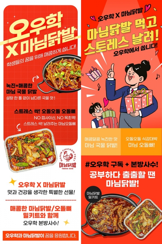 '오우학'은 자라나는 성장기 학생들을 위해 맛과 영양을 동시에 잡은 '마님 닭발'과 컬래버를 진행하기로 결정했으며, 새로 출시한 '마님 닭발' 밀키트를 보다 많은 학생이 즐길 수 있도록 흥미로운 이벤트를 마련할 예정이다.