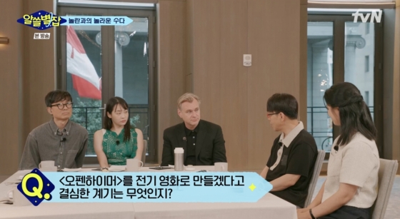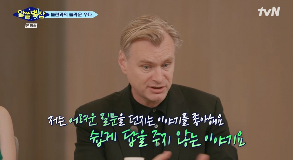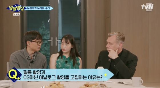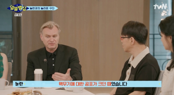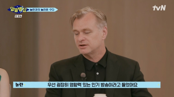 이날 놀란 감독은 MC 장항준 김민하와 이동진 유현준 김상욱 심채경과 인사를 나누며 "'알쓸별잡'이 굉장히 영향력 있는 인기 방송이라 들었다. 한국 영화 팬과 대화할 수 있는 좋은 기회라고 생각했다"라고 말했다.