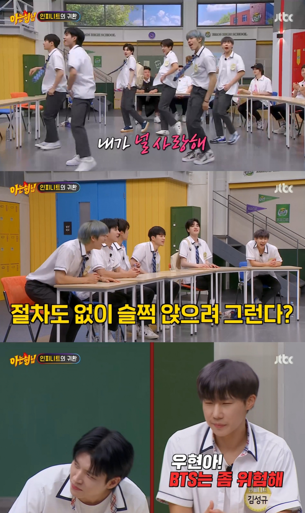 '아는 형님' 멤버들은 인피니트에게 "너네 은근슬쩍 앉으려고 한다. 안된다. 우리가 예전이랑 다르다"라고 말했다.